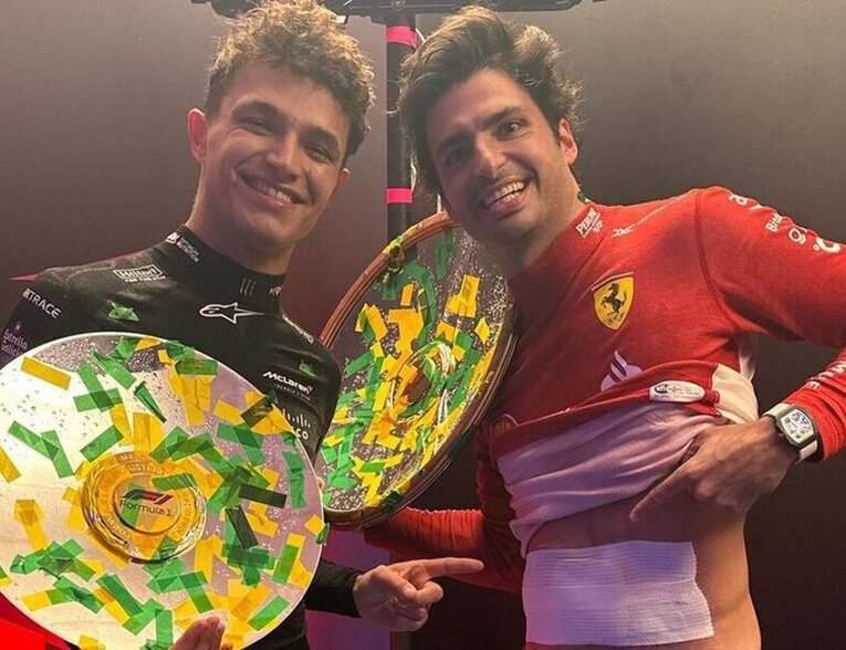 Карлос Сайнс и Ландо Норрис, бывшие напарники по команде "Макларен", снова оказались вместе, но уже на подиуме гонки. После финиша Сайнс выложил фото, на котором они оба с радостью улыбаются.